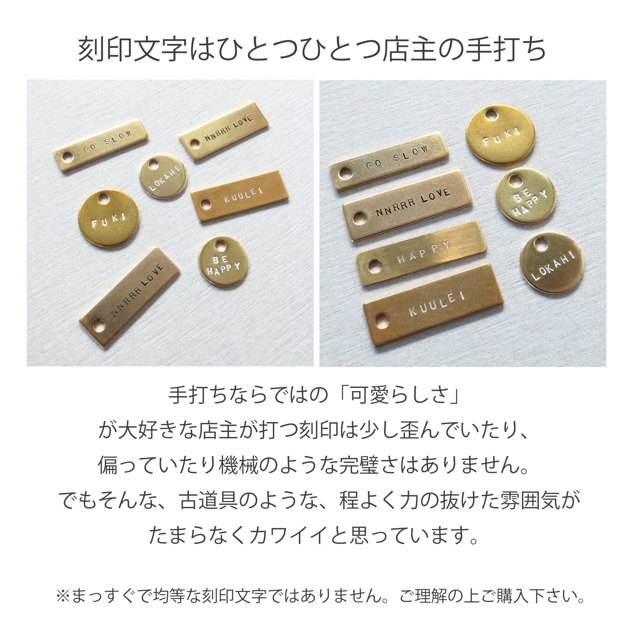 *1文字ずつハンマーによる店主の手打ち、真鍮プレートは無垢素材(キズや染みもあるそのままの姿)です。程よく力の抜けた〈ゆらぎ〉がある印字、素材となります。ハンドクラフトの特徴として楽しんでいただけたら最高に嬉しいです。