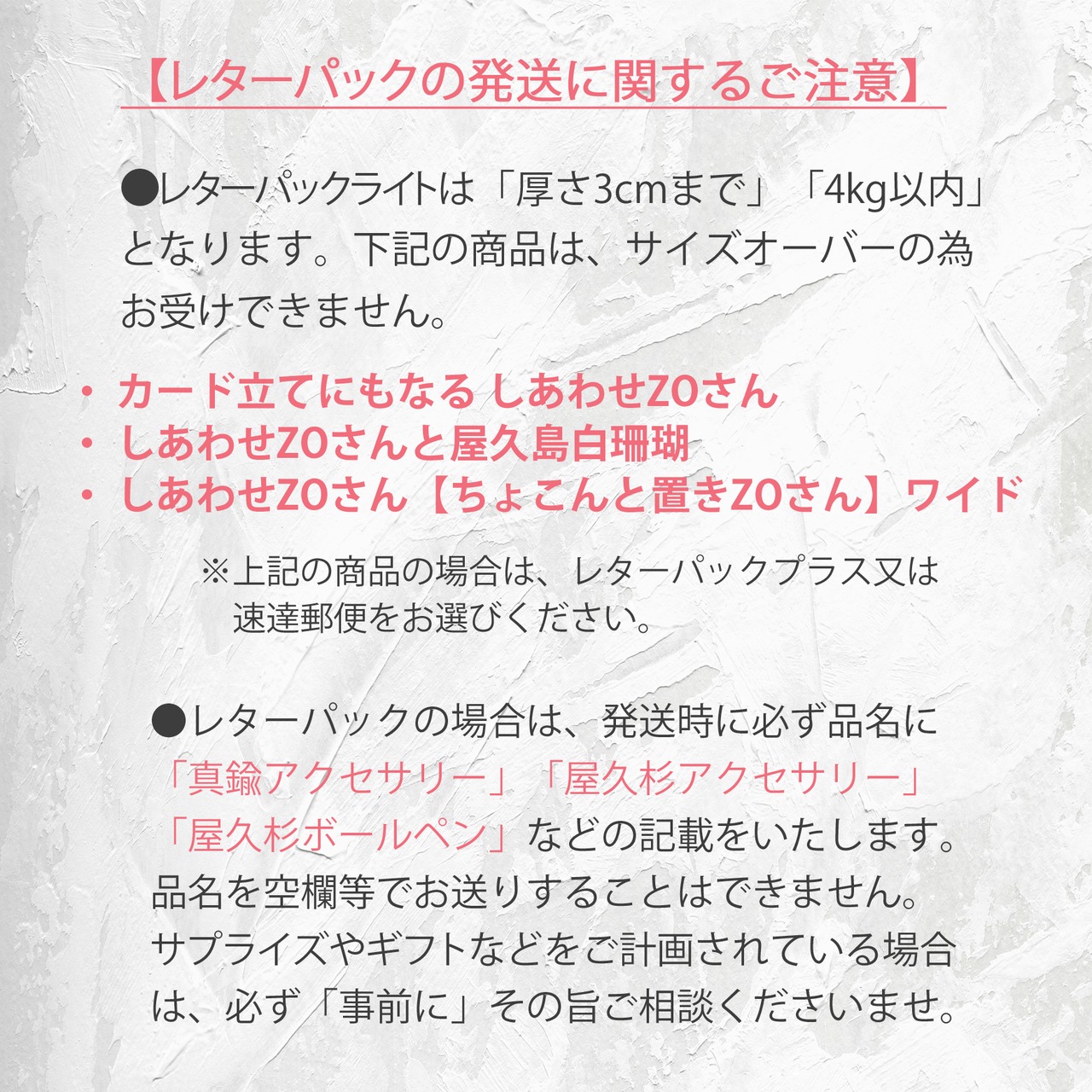 上記の規格をこえてしまう下記の商品は、「レターパックプラス」「速達郵便」をオプションよりお選びくださいませ。