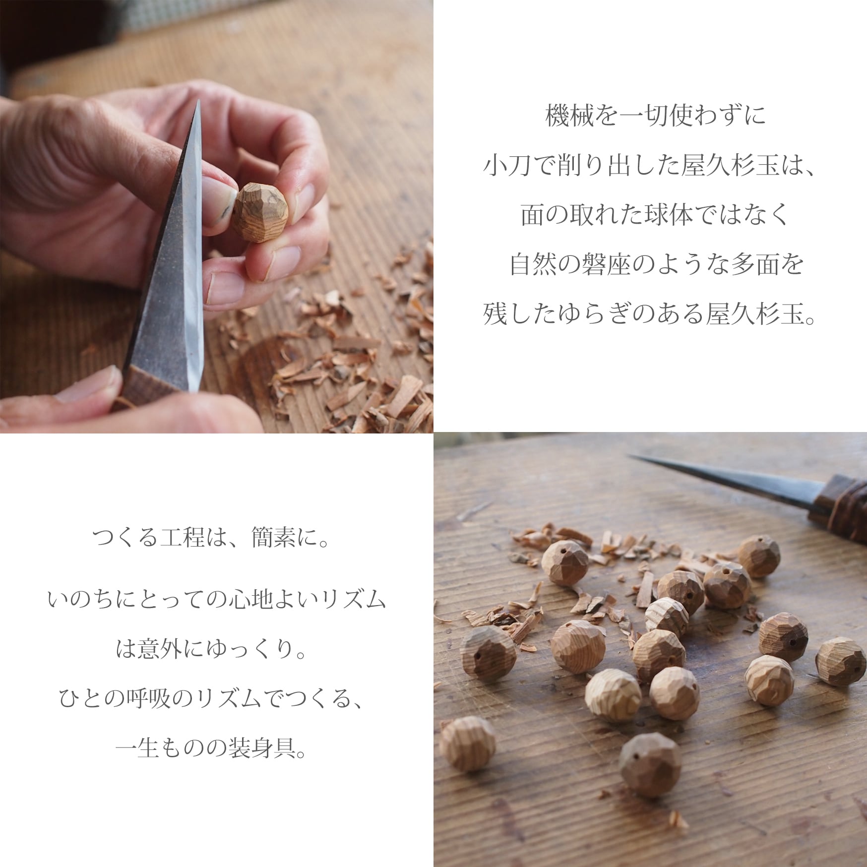 初めから終わりまで切り出し小刀1本で手削りで仕上げた屋久杉の自然なゆらぎ。屋久杉を削る過程で高速で回転する機械や工具は一切使用せず、ひとの呼吸のリズムでつくります。